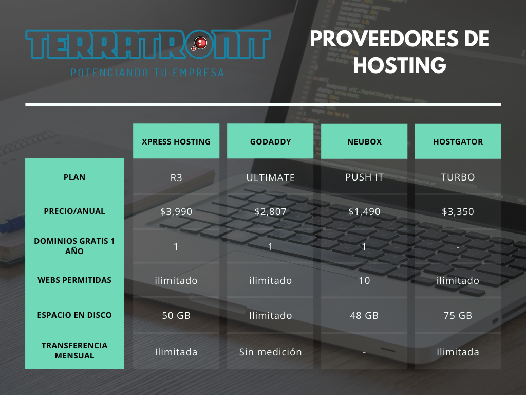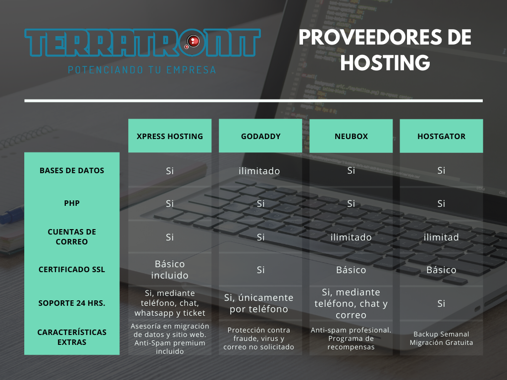 Nosotros como una empresa dedicada a la creación de páginas web de diferentes tipos: informativas, blog y eCommerce, necesitamos un proveedor de hosting robusto y que nos permita tener las páginas de nuestros clientes en perfecto estado, por ello TERRATRONIT te recomienda ampliamente el proveedor XPRESS HOSTING, debido a que, presenta precios excelentes, características diferenciadoras y un servicio de soporte excelente.